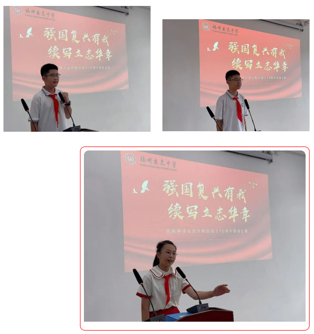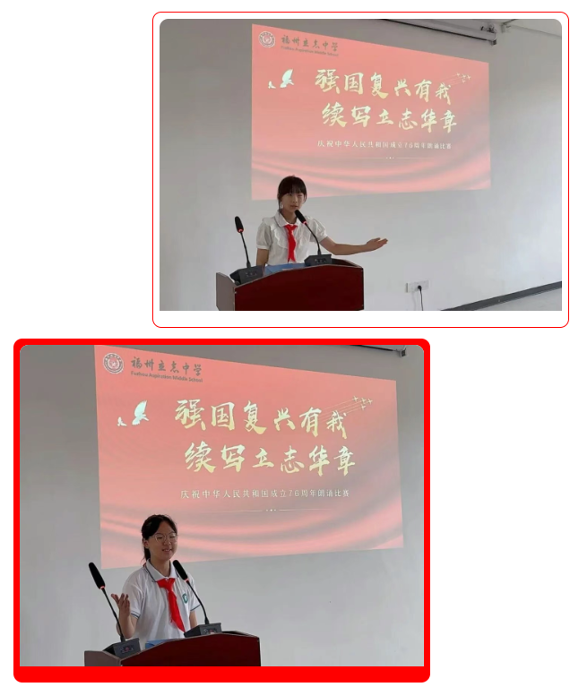 在朗诵比赛中,同学们以铿锵有力的语调、饱满真挚的情感,讲述祖国发展的辉煌成就,诉说新时代青少年的责任与担当。一篇篇经典篇目、一声声深情告白,不仅展现了立志学子的演讲风采,更传递出对祖国母亲最炽热、最深沉的爱。