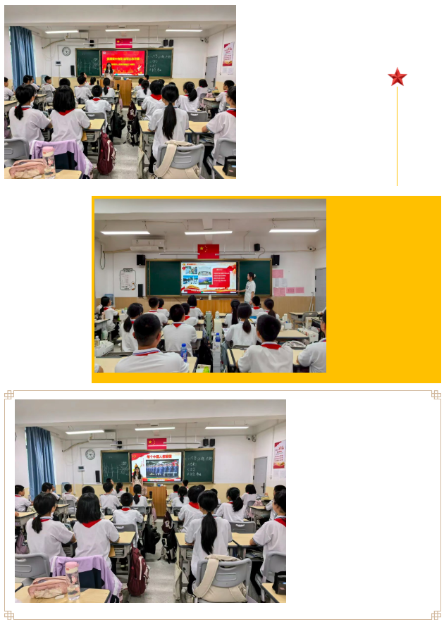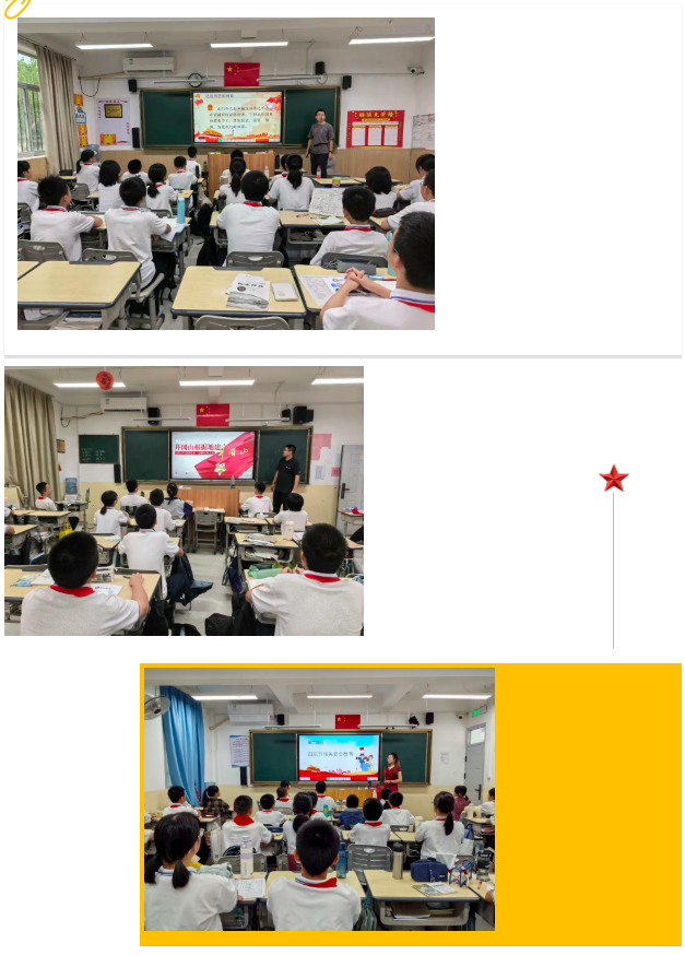 国庆假期前,各班级开展主题班会,通过观看国庆纪录片、分享爱国故事、讨论“如何做新时代立志好少年”等问题。同时,班会还融入国庆假期安全教育,各班班主任从交通安全、消防安全、防溺水安全等方面进行细致讲解,确保同学们度过一个安全、充实的假期,做到爱国与安全两不误。