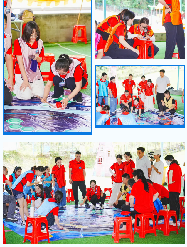 接下来的 “步步为赢” 主题团建中,一系列精彩的游戏轮番上演,考验着各团队的智慧、速度与协作能力。“捕鱼达人” 环节,老师们双手紧握绳头,默契配合,小心翼翼地钓起地面的 “鱼” 并精准甩到中间的网上,每一次成功都伴随着阵阵欢呼;“领地五子棋” 里,参赛队员凝神思考、巧妙布局,场外队友出谋划策,展现了极强的战略思维;“拼图大战” 中,各队成员分工协作、细致观察,在与对手的比拼中快速拼接方块,充分发挥了团队的智慧合力;“撞柱游戏” 里,老师们屏气凝神、精准击打,为团队争取高分;“黄金争夺赛” 中,参赛老师手持筷子,眼疾手快地夹起金珠,现场加油声、呐喊声此起彼伏。在一个个游戏中,老师们互帮互助、密切配合,不仅收获了快乐,更深刻体会到了团队协作的重要性,凝聚了强大的团队力量。